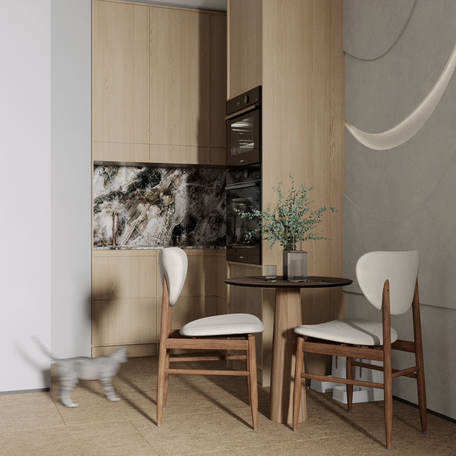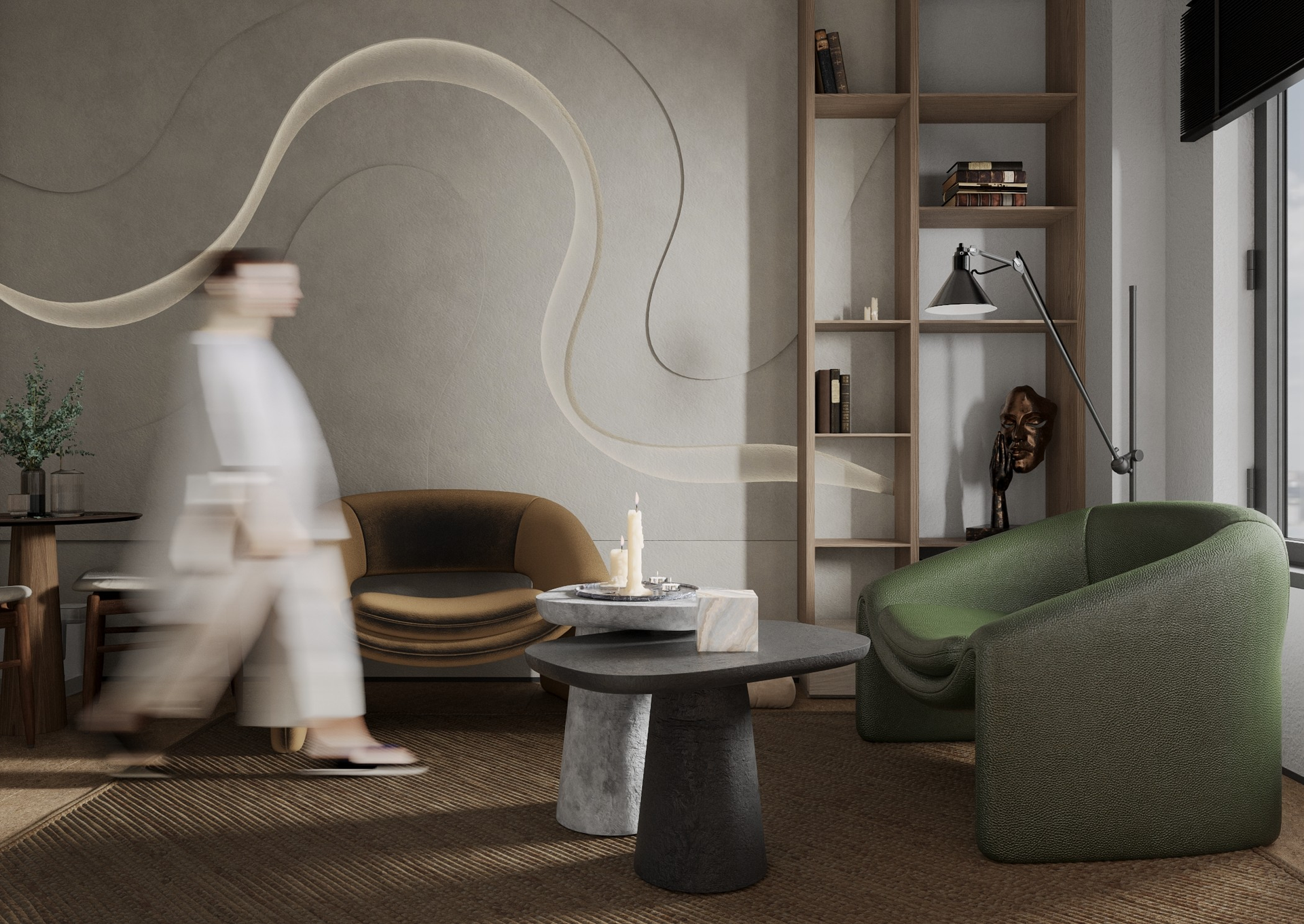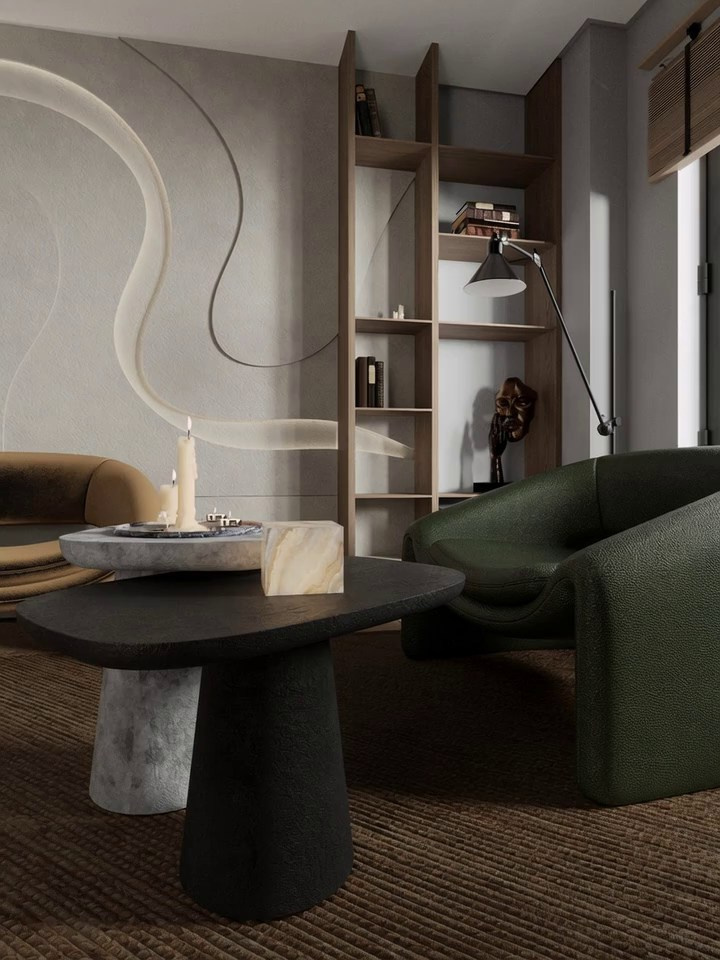 Я использовала тактильный минимализм (фокус на текстурах, стены из бетона или панелей,